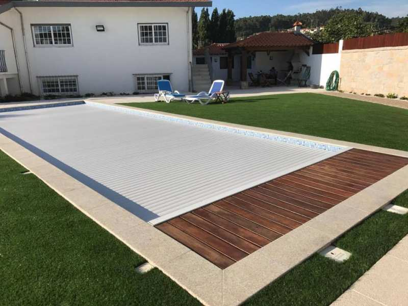 O motor está instalado num local ventilado e o enrolador está separado da piscina, por uma parede de separação.