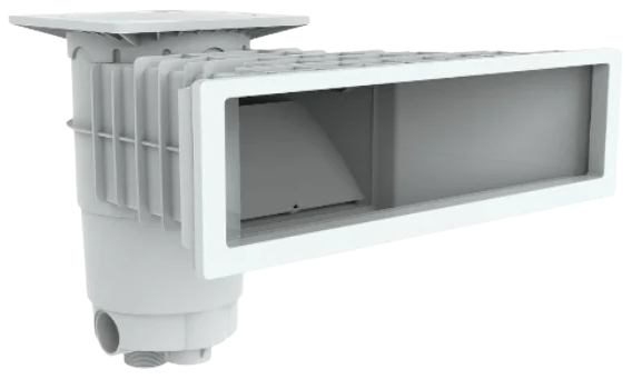 Skimmer muito discreto, concebido para funcionar com o nivel de água a 45 mm do topo do skimmer.